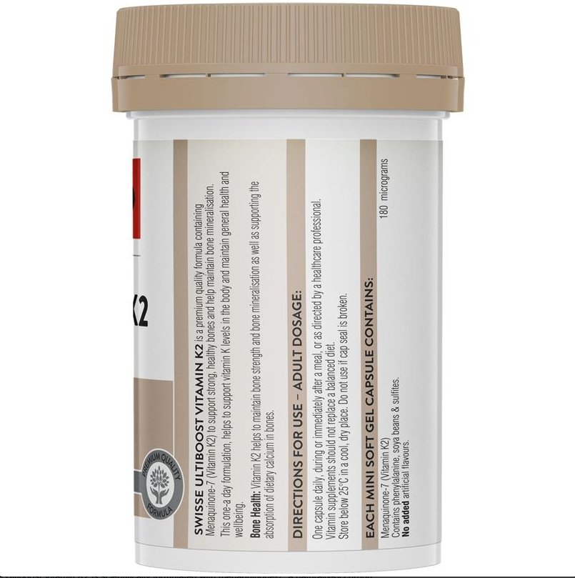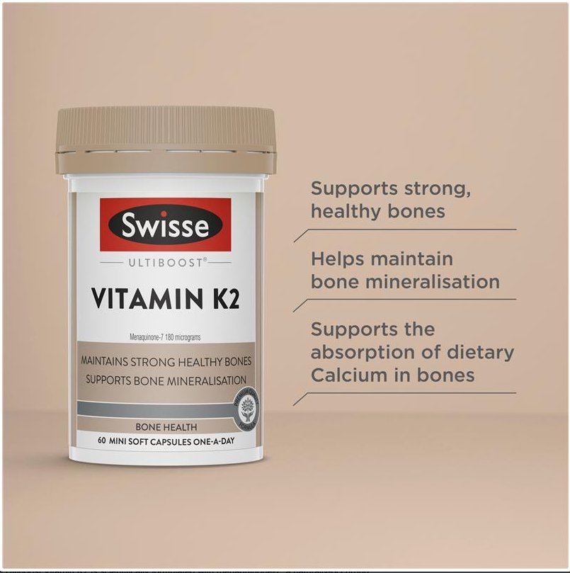 Swisse Ultiboost Vitamin K2 60 Capsules Support strong, healthy bones and bone mineralisation with Swisse Ultiboost Vitamin K2. This premium quality supplement also supports the absorption of dietary calcium in bones, and maintains general health and wellbeing. Swisse Ultiboost Vitamin K2 is scientifically formulated with menaquinone-7, a naturally-occurring form of vitamin K2, which is more easily absorbed than other forms of vitamin K*. This premium quality formula helps maintain healthy vitamin K levels in the body, to support bone strength and bone mineralisation, as well as supporting the absorption of dietary calcium in bones. If you’re wondering why it’s called ‘K’, it comes from the Dutch word ‘Koagulation” and was chosen by the scientist who discovered it in the 1920s^. Consider adding this bone-supporting supplement to your wellness routine to help maintain an active lifestyle. Suitable For: Adults Size: 60 Capsules KEY FEATURES • Maintains healthy vitamin K levels in the body. • Contains menaquinone-7, which has greater bioavailability than other forms of vitamin K. • Available in a convenient, one-a-day formula. • Supports strong, healthy bones. Warnings Vitamin supplements should not replace a balanced diet. Ingredients EACH MINI SOFT GEL CAPSULE CONTAINS: Menaquinone-7 (Vitamin K2) 180 micrograms Contains: Phenylalanine, soya beans & sulfites. No added artificial flavours.