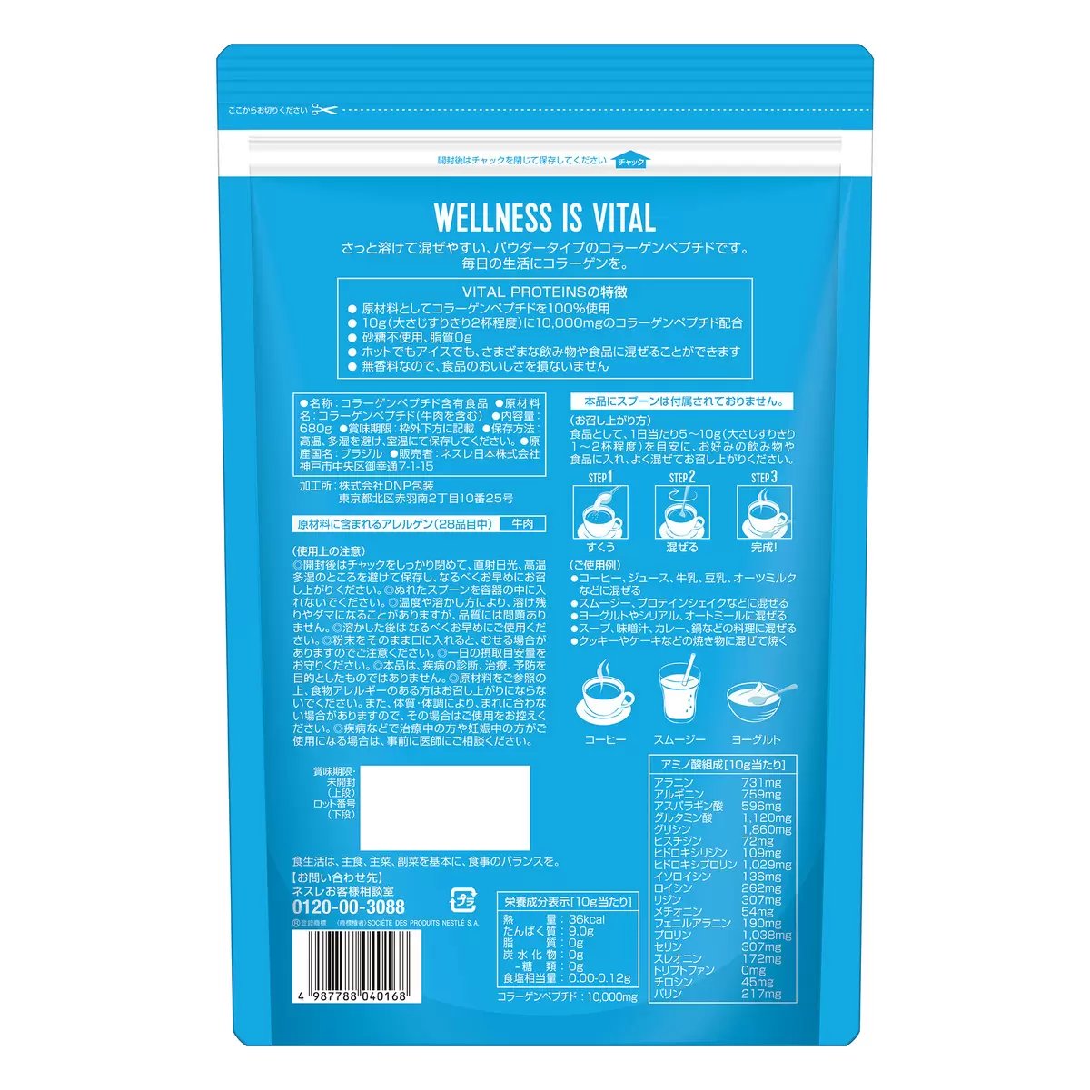 全米売上No.1※1コラーゲンブランド 原材料として、コラーゲンペプチド100%配合 1日摂取目安量あたり36kcal(1日10g摂取の場合) 砂糖不使用、脂質0g 無香料・無着色