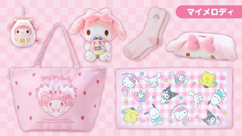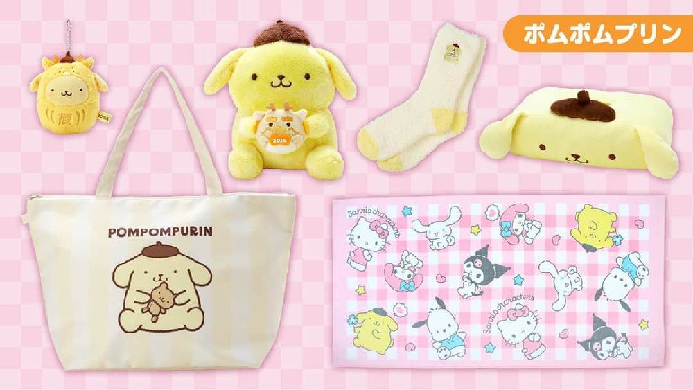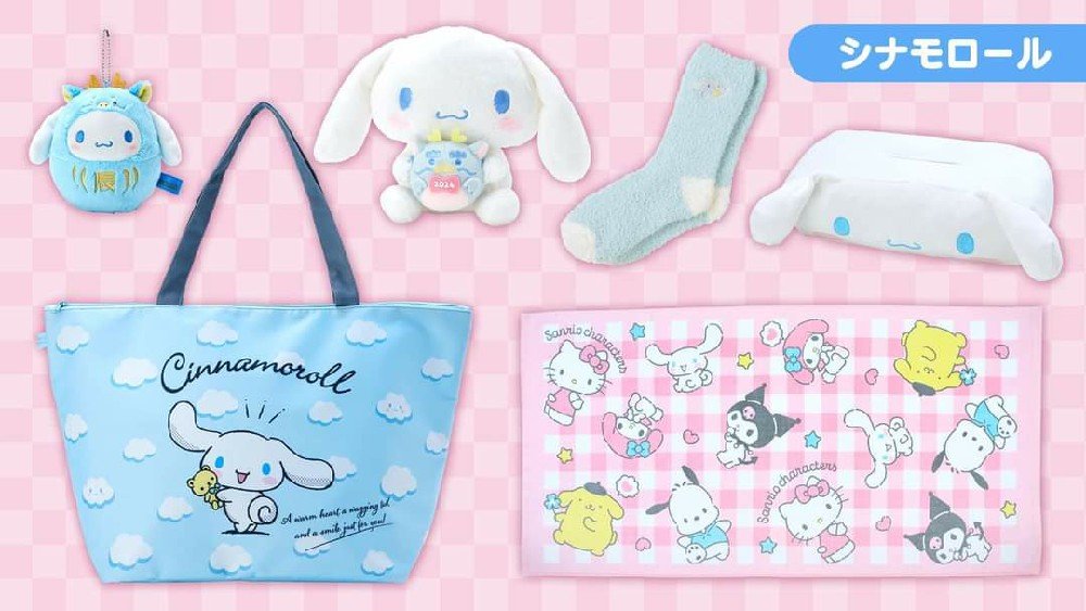 Sanrio 福袋 共6個角色 Hello Kitty、Cinnamoroll、Pompompurin、My Melody、Kuromi、Pochacco ■陣容 吉祥物掛件十二生肖毛絨動物(附2024年名稱) 襪子 紙巾盒 手提袋 浴巾