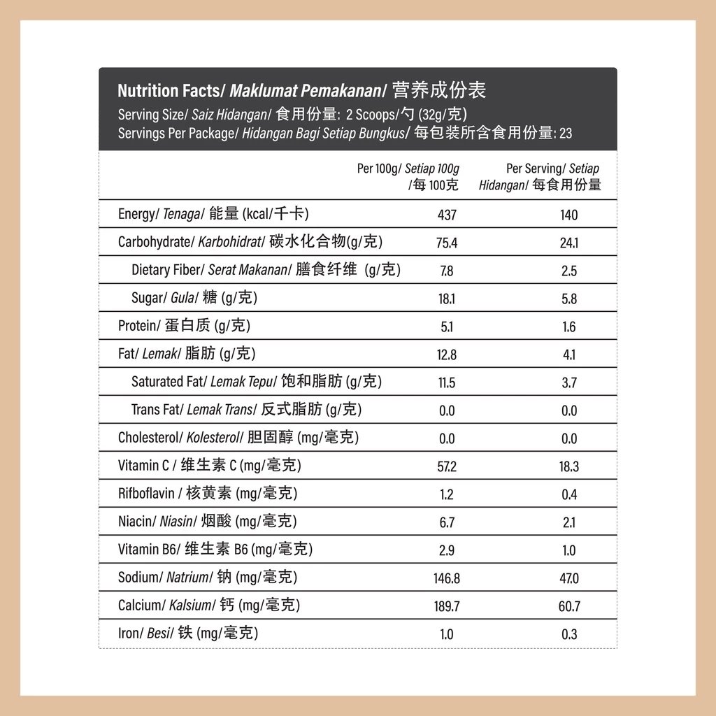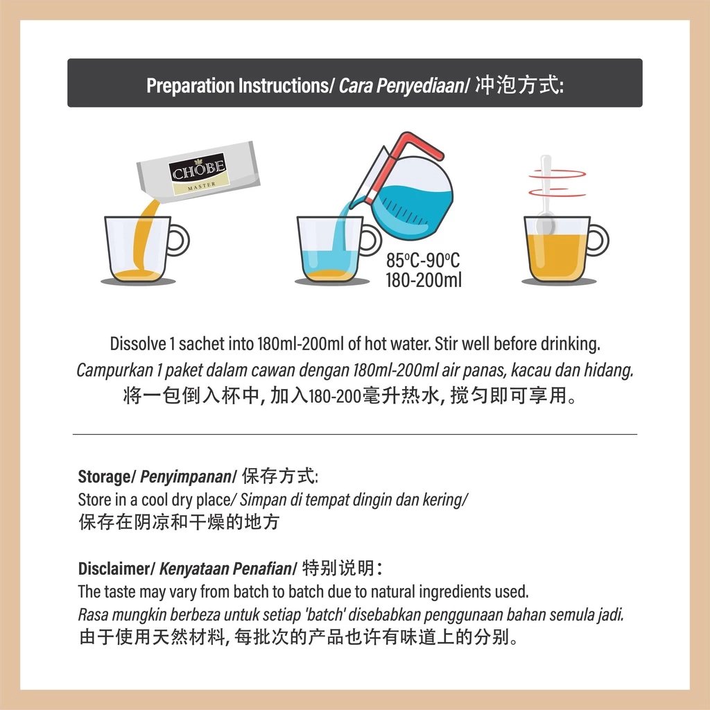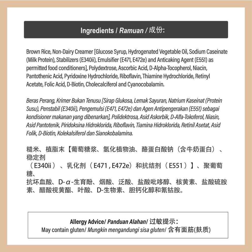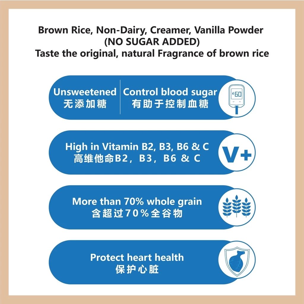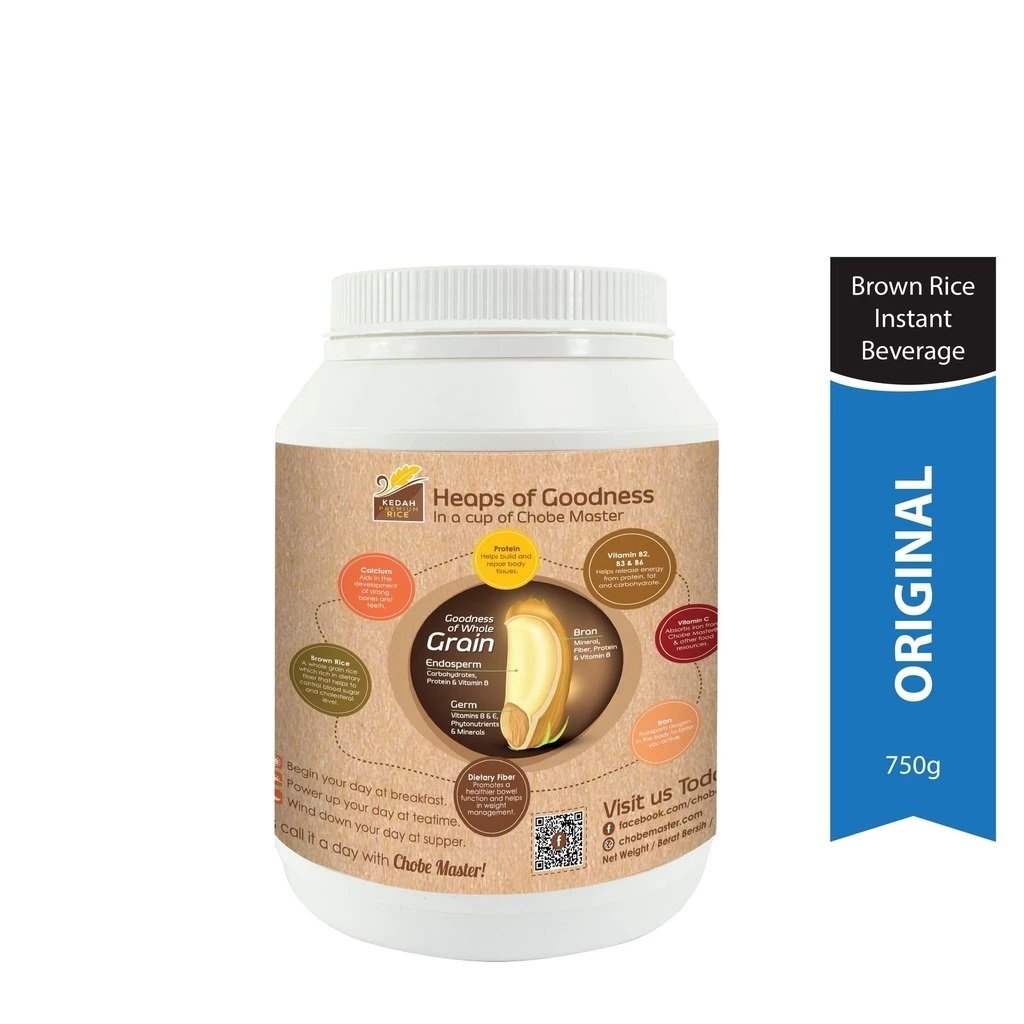 CHOBE MASTER INSTANT BROWN RICE DRINK (ORIGINAL) NO SUGAR ADDED WHAT IS CHOBE MASTER INSTANT BROWN RICE DRINK (ORIGINAL) NO SUGAR ADDED? Chobe Master Instant Brown Rice Drink (Original) carries the original natural fragrance of brown rice. It is smooth in texture and creamy vanilla taste. Using whole brown rice grains, the germ and bran of brown rice (more than 70% whole grain per serving) provide great sources of dietary fiber and Multivitamin. Nowadays, most of the population in Malaysia will consume more white rice than brown rice, and an estimated around 6% out of 31.95mil Malaysian (2019) drink soft drinks several times daily. WHAT WILL HAPPEN TO YOU? ✅ Risk Of Diabetes ✅ Risk Of Heart Health ✅ Risk Of High Blood ✅ Risk Of High Cholesterol ✅ Digestive Problem ✅ Risk Of High Glucose ✅ Obesity WHAT ARE THE BENEFITS OF CONSUMING A CHOBE MASTER INSTANT BROWN RICE DRINK (ORIGINAL) NO SUGAR ADDED? 👉 Control Cholesterol Levels 👉 Boost Heart Health 👉 Improve Digestive Health 👉 Beneficial For Nervous System 👉 Boost Immune System WHO CAN DRINK CHOBE MASTER INSTANT BROWN RICE DRINK (ORIGINAL) NO SUGAR ADDED? ✅ Diabetes Patient ✅ Gout Patient ✅ Senior Citizen ✅ Kids (4 Years Old & Above) ✅ Pregnant / BreastFeeding Mom (need to take more water) PRODUCT FEATURES HIGHLIGHTS - Unsweetened / No sugar added - More than 70% whole grain - High in Vitamin B2, B3, B6 & C - Source of Calcium - High in Dietary Fiber - Zero Cholesterol & Trans Fat - No Preservatives - No Artificial Coloring INGREDIENTS Brown Rice, Brown Sugar, Multivitamin, Polydextrose (**No Sugar Added) WHY ADD POLYDEXTROSE? Prebiotics (soluble fiber) help promote the growth of good bacteria in our gut. It promotes regularity, reduces constipation, supports healthy blood glucose, and may assist with weight management. POLYDEXTROSE - A soluble fiber & healthful in prebiotic benefits. - Is bifidogenic (help to increase intestinal bifidobacteria & maintain good intestinalmicroflora. - Help promote regularity, as a result of its faecel bulking. - Supports healthy blood glucose levels by eliciting a lower blood glucose response. - Is ideal for reduced-calorie foods and may assist with weight management. - Heat, pH, and Shelf life stable over Inulin/ GOS / FOS. SERVING PREPARATION ✅ Add 2 scoop into a cup. ✅ Add about 180ml hot water (85˚C-90˚C). ✅ Stir well and serve.