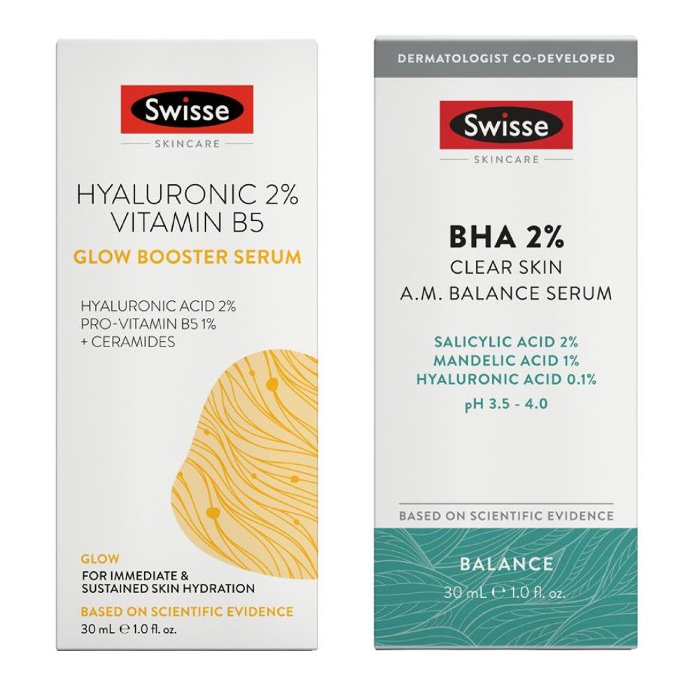 1️⃣Swisse Skincare BHA 2% Clear Skin AM Balance Serum 清透肌膚 AM 平衡精華 30ml * 改善皮膚紋理和清晰度,並預防痘痘 * 有助於預防痘痘並控製粉刺 * 2% 水楊酸具有溫和的去角質特性,可改善毛孔外觀並控製粉刺 * 1% 扁桃酸具有去角質和減少粉刺的功效 * 0.1% 玻尿酸明顯滋潤肌膚 * 專為AM 美容程序而設計 * 與皮膚科醫師共同開發 2️⃣Swisse Beauty Hyaluronic 2% Vitamin B5 Glow Booster Serum 透明質酸 2% 維生素 B5 煥發精華液 30ml * 玻尿酸明顯增強保濕效果 * 含有神經醯胺,具有保濕作用 * 免受環境壓力 * 提供容光煥發、水潤的膚色