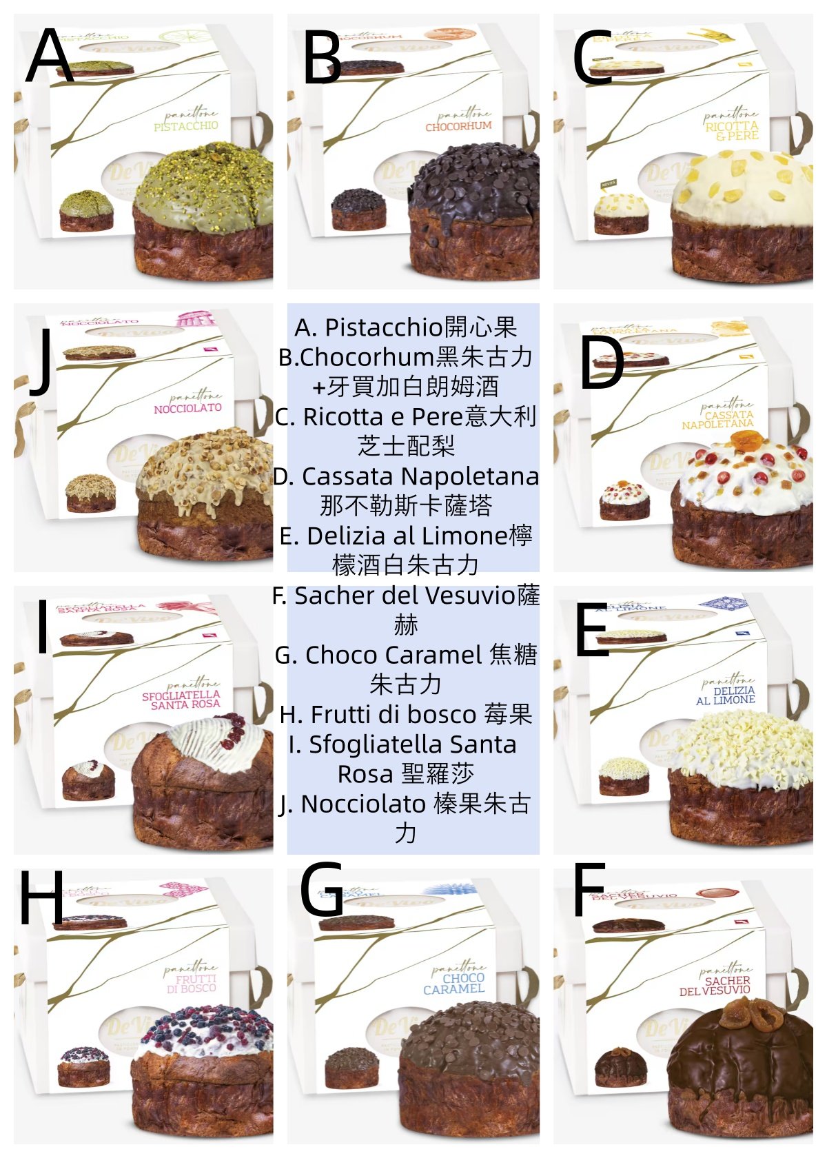 A. Pistacchio - Pistachio B. Chocorhum C. Ricotta e Pere - Ricotta and Pear D. Cassata Napoletana - Neapolitan Cassata E. Delizia al Limone - lemon delight (contain lemon liquor) F. Sacher del Vesuvio G. Choco Caramel H. Frutti di bosco - Wild Berry I. Sfogliatella Santa Rosa - Santa Rosa Sfogliatella J. Nocciolato - Hazelnut You may choose any one of the above flavours Weight (g): 1300