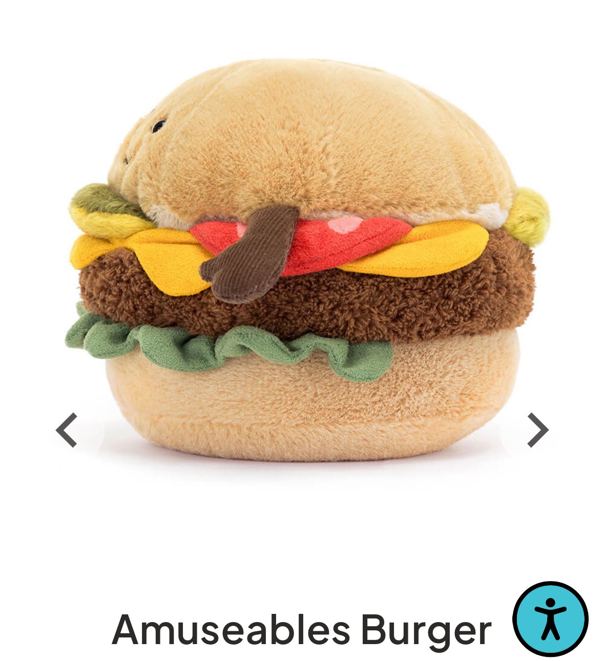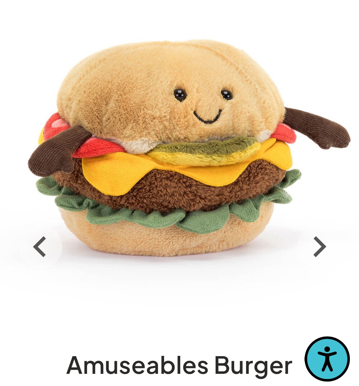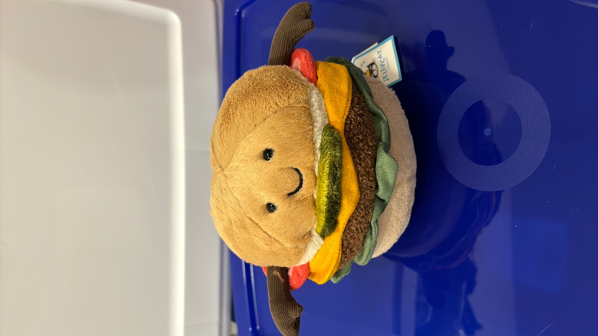 The star of any barbecue bash, Amuseables Burger's dressed to impress! From top to bottom, this burger's rocking a brilliant two-tone golden bun, cordy arms, a fluffy green gherkin, suedey yellow cheese and foldy lettuce! Oh yes, and the chunkiest fuzzy burger patty! Dimensions: 4.7in x 4.7in x 4.3in Sitting Height: 4in Main Materials: Polyester Inner Filling: Polyester Fibers, PE Beans Hard Eye