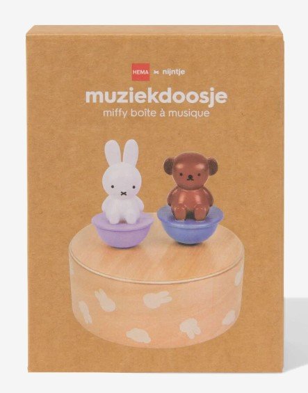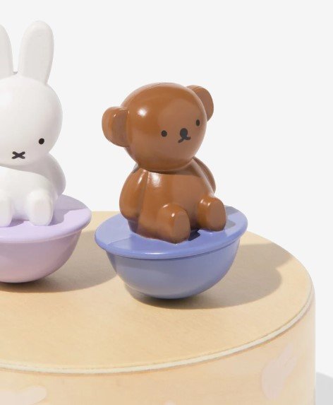 This wooden music box has a round shape and subtle Miffy prints. On top are Miffy and Boris, both on a wobbly disk. Set it down and listen to the soothing melody together. This will make bedtime a wonderful time for you and your little one. Size: 11cm (diameter) X 13cm (height)