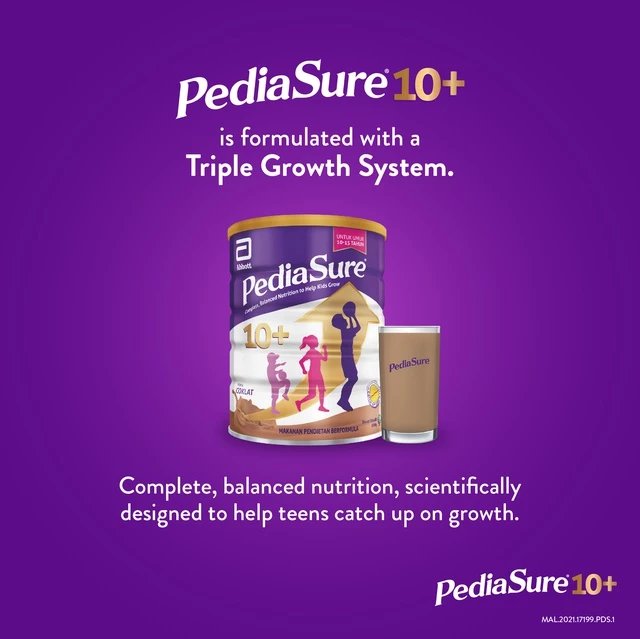 PediaSure® 10+ is a complete, balanced nutrition supplement, scientifically designed to support the nutritional needs during periods of accelerated growth in kids 10-15 years of age with a unique Triple Growth System, supporting increased height, energy release and overall growth and development. PediaSure® 10+ is suitable for children aged 10-15 years who: • Has limited intake of balanced nutrients i.e. carbohydrate and protein. • Eats few fruits and vegetables. • Very active but eats little • Always skipped meals i.e. breakfast • Has poor appetite. • Needs a nutritious snack or supplement. • Wants to catch up on growth PediaSure® 10+ Features: • Contains 38 key nutrients which includes arginine and 2X calcium*, 1.6x vitamin D* and 2x Natural vitamin K2* for building strong bones. • 25% more* Triple Protein Complex with 3 protein sources – milk protein concentrate, whey protein concentrate, and soy protein isolate provide a scientifically balanced blend of all essential amino acids to support growth and development. • Provide 100% daily requirement^ of Vitamin D which helps to promote calcium absorption. • Contains Vitamin A, D and Zinc which are important for the body. • Contains FOS, a non-digestible dietary fibre that is the preferred food of good bacteria. • Contains 1kcal per 1ml to provide extra energy for growing children. • Contains DHA to supports brain development. • Gluten-free. *compared to Pediasure ® designed for 1-10 years ^2 servings per day meets 100% MY RNI 2017 for Vitamin D ** Country of Origin: Singapore/ Europe