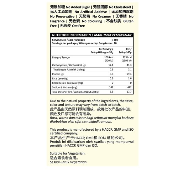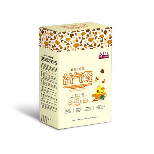 白色補益肺常健康 在中醫理論中,白色的食物加上虎乳芝等多種含有多糖體的菇菌類,可維持身體第一防護健康。 配方特別加入夏威夷果,營養豐富,口感香醇。 成份: 糙米,菊粉,百合,夏威夷果 (9%),淮山,小米,南杏仁,蟲草花,陳皮,巴西蘑菇(2%),北芪,紫錐花,虎乳(0.4%),甜菊。 過敏源資訊: 生產線亦處理堅果和大豆 食用建議: 將1小袋谷粉倒入200ml熱水中(70-90°C)。 攪拌均勻即可享用。 儲存方法: 存放在陰涼乾燥處。 遠離陽光照射。 此產品由天然原料調製而成,故每批次產品的味道、顏色及口惑可能會有差異。