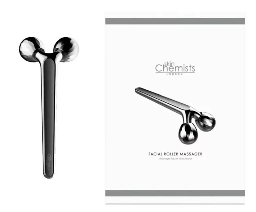 Skin Chemists Facial Roller Massager offers an original and effective at-home contouring massage for your face. The high-quality zinc alloy body frame is glossy and sleek, which offers a pleasant tactile experience while the diamond cutting roller massages your skin. The massaging roller balls would deliver pinching & pressing motions, which lift and firm your skin with care. Contour Face Massager 58.8° Golden Angle Metal Handle